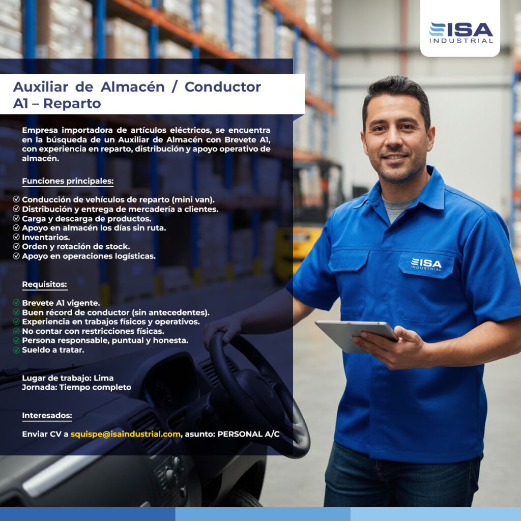 Funciones principales: ☑️Conducción de vehículos de reparto (mini van). ☑️Distribución y entrega de mercadería a clientes. ☑️Carga y descarga de productos. ☑️Apoyo en almacén los días sin ruta. ☑️Inventarios. ☑️Orden y rotación de stock. ☑️Apoyo en operaciones logísticas.