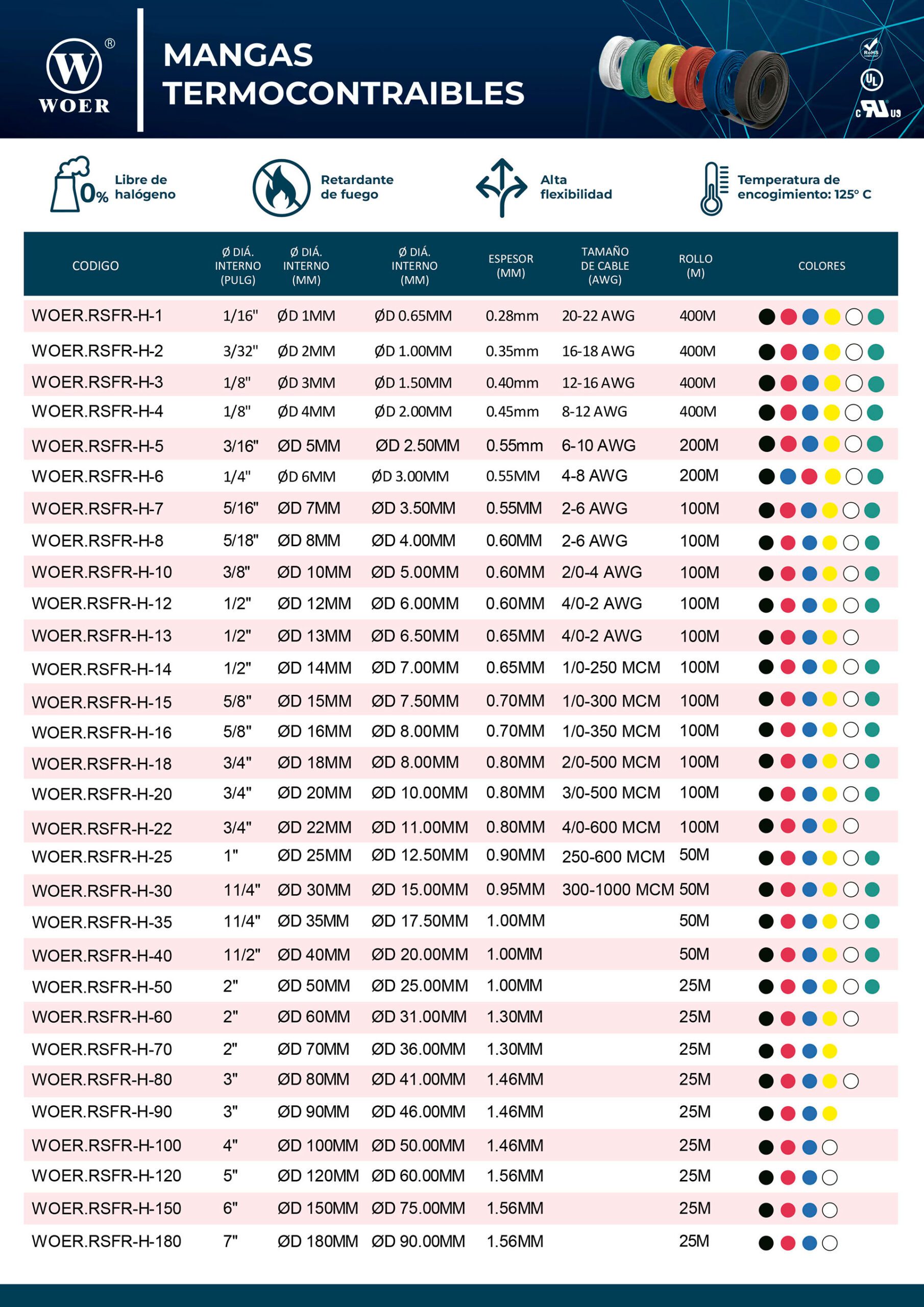 W-RSFR-125ºC Tubing termocontráctil calidad premium. Libre de halógenos, flexible, retardante a la flama, libre de metales pesados y libre de PBBs y PBDEs. Cumple con certificación IL,CSA, VW-1, RoHS y Sony entre otras. Bajo nivel de humo si se quema. Temperatura de operación continua: -55ºC a 125ºC. Temperatura de cotracción: 120ºC.